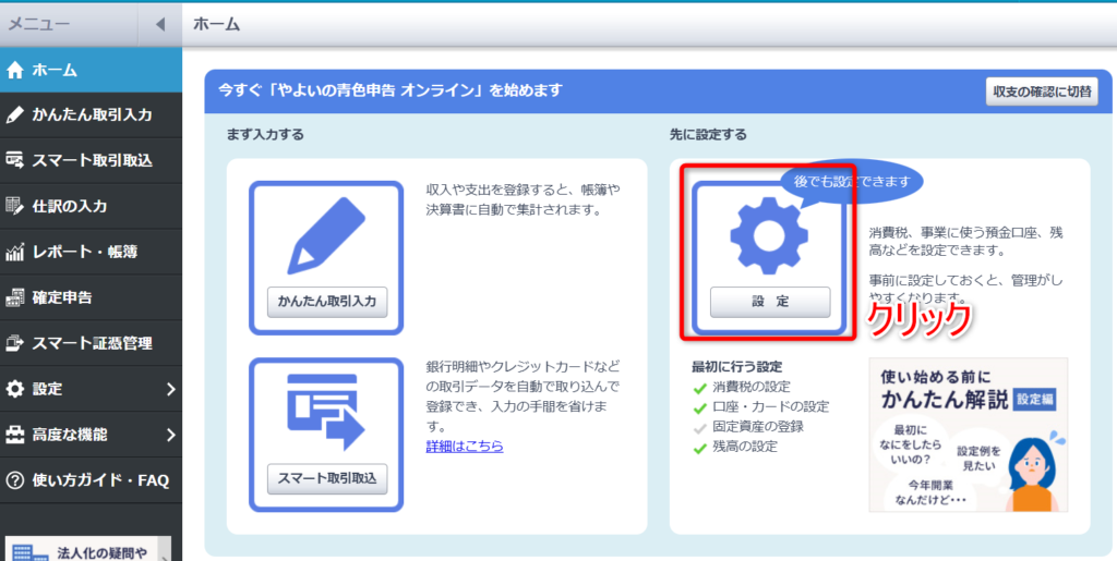「やよいの青色申告オンライン」のホームから「設定」に進みます。